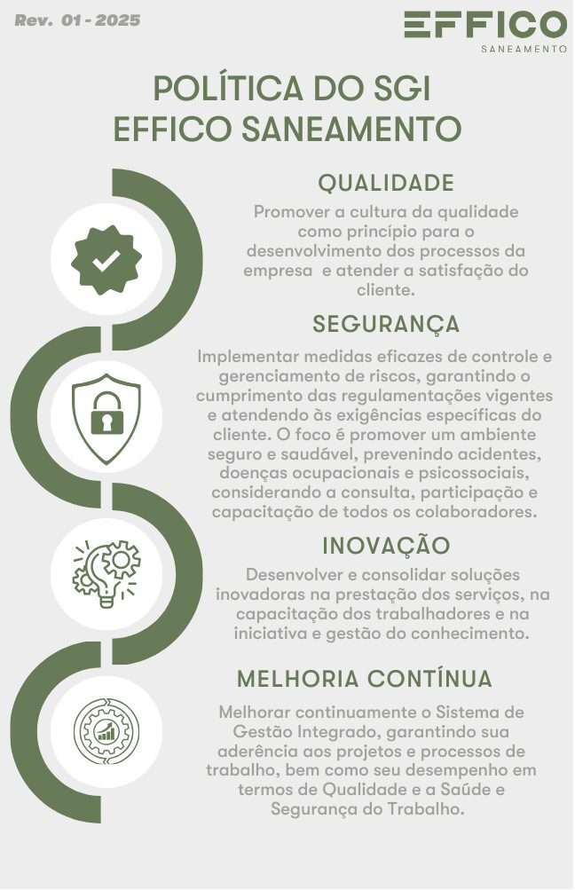 Preocupada com a garantia da qualidade das suas operações, com o atendimento das partes interessadas e a integração e segurança de seus processos, a EFFICO Saneamento decidiu implantar um Sistema Integrado de Gestão, que visa garantir os seguintes pilares: